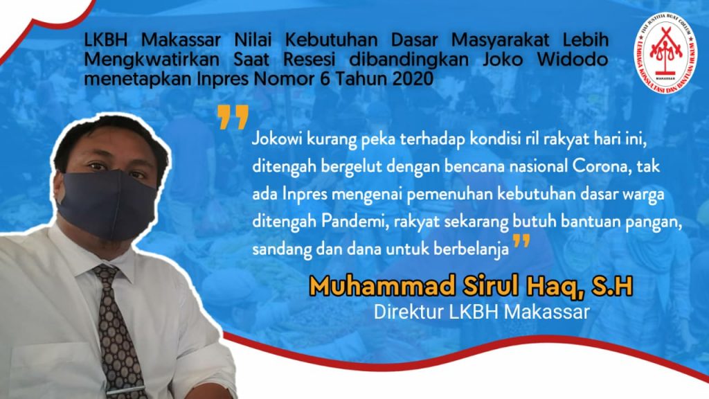 Resesi ekonomi Indonesia berada pada angka -5,31%. Direktur LKBH (Lembaga Kajian dan Batuan Hukum) Makassar, M Sirul Haq melihat angka ini mencerminkan kondisi yang memprihatinkan. Berpotensi mengancam kebutuhan dasar warga.
