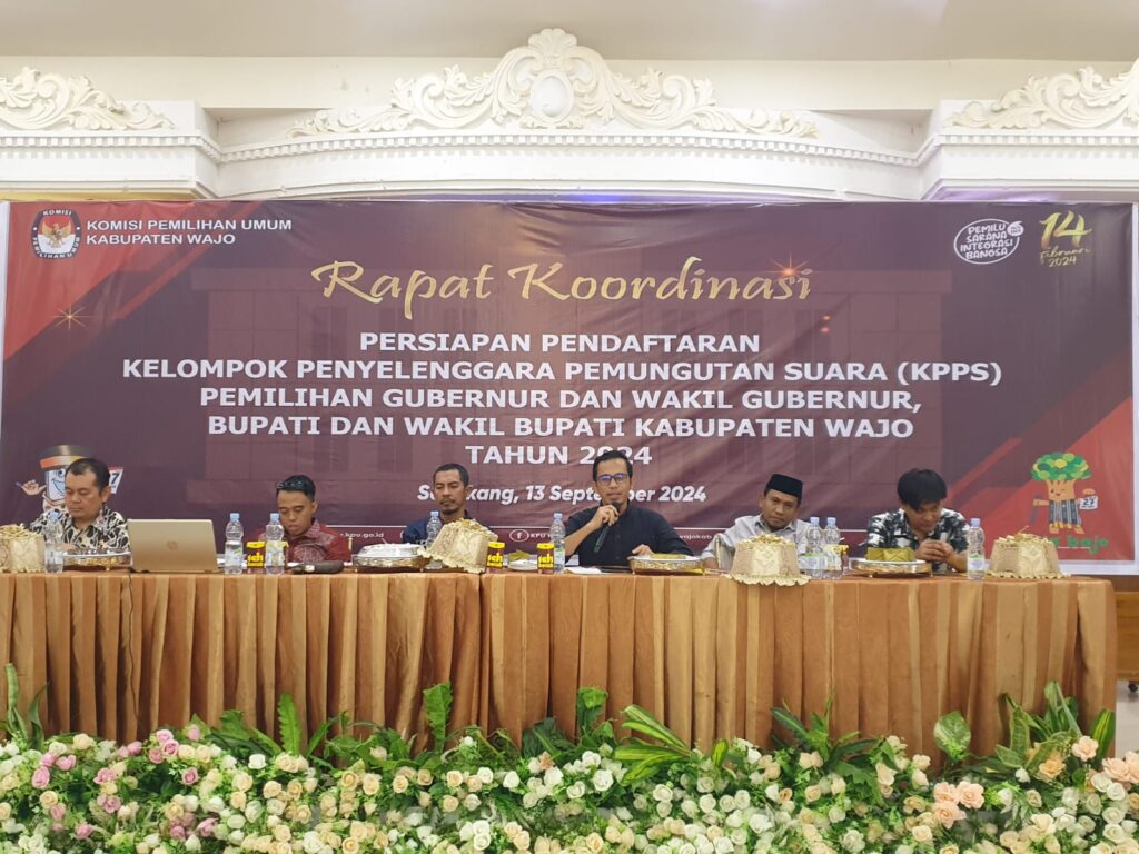 Wajo – Komisi Pemilihan Umum (KPU) Kabupaten Wajo, Provinsi Sulawesi Selatan (Sulsel) melaksanakan Rapat Koordinasi (Rakor) Persiapan Pendaftaran Kelompok Penyelenggara Pemungutan Suara (KKPS) di Gedung Darmawan Sengkang, Jumat (13/9/2024).